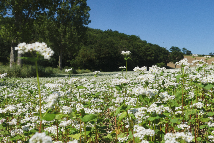 Il est semé début mai, désherbé mécaniquement et récolté courant septembre.